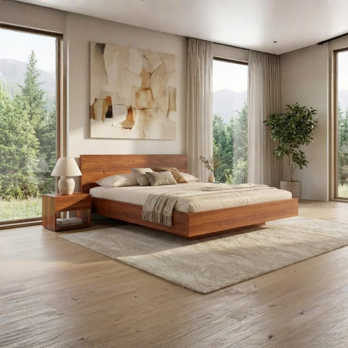 Transform your bedroom with the Tianz Queen Size Bed Frame, a marvel of modern design. Its signature floating silhouette features a recessed base that creates a stunning illusion of weightlessness, making your room feel more spacious. The expansive solid teak headboard highlights the wood’s rich, natural grain, offering a sleek, minimalist focal point that elevates your sleep sanctuary.